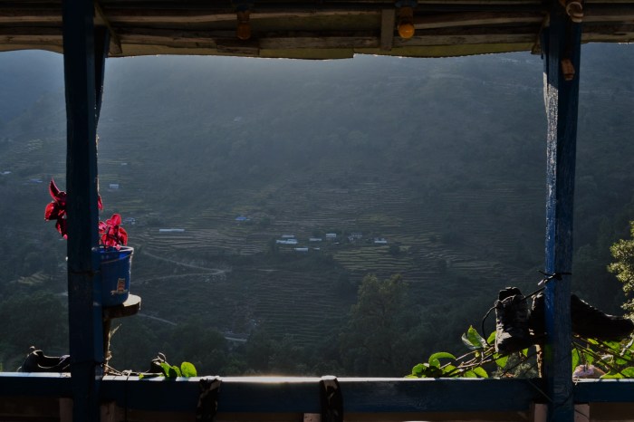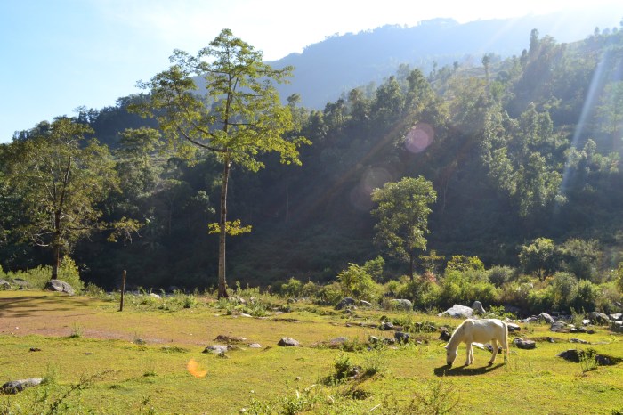 Emprendimos nuestro camino ascendiendo suavemente hasta Hile, cruzando arrozales verdes y riachuelos.  A medida que avanzábamos observamos campos de cultivo, cabras pastando y huertos de frutas que jamás habíamos visto. Conocimos además, pueblos muy pequeños, perdidos en la inmensidad de las montañas, donde tuvimos un recibimiento, honestamente, bastante descafeinado. Supongo que hace unos años, antes de que esta ruta fuese tan popular, la gente te recibía con una sonrisa y un té caliente, pero salvo honrosas excepciones, esperar esta clase de hospitalidad hoy en día es tan difícil como que tu madre pronuncie Bershka correctamente. Aunque esto es tan solo mi opinión, y ya sabéis, las opiniones son como los corredores de bolsa en el mercado de valores: son estupendos cuando están de tu lado.
